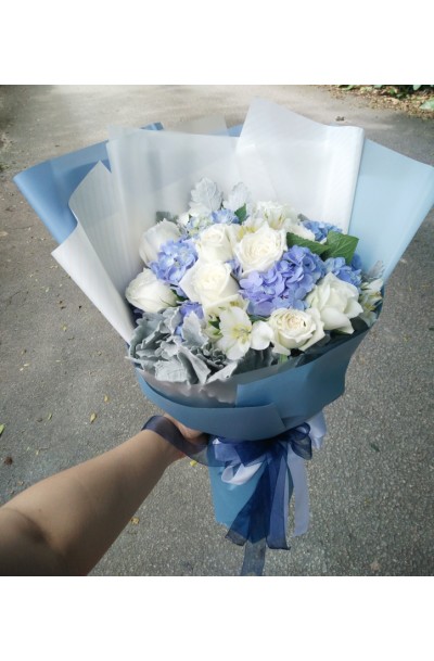 | Description: | A bouquet of blue hydrangea with white roses, alstroemeria and dusty miller.