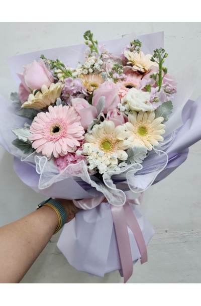 | Description: | A pastel mix bouquet. Actual colour tones of flowers may slightly differ from image. Tree House Flowers & Gifts reserves the right to replace any item in the arrangement with another of higher or equivalent value depending on availability